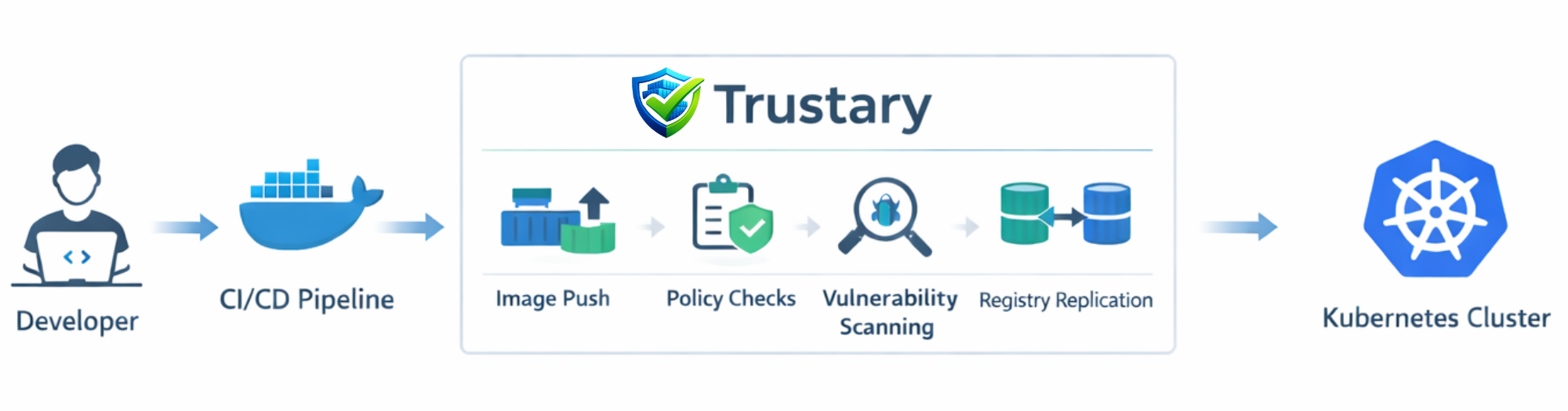 Trustary sits at the center of the container delivery pipeline, acting as a secure control plane for container images and artifacts.